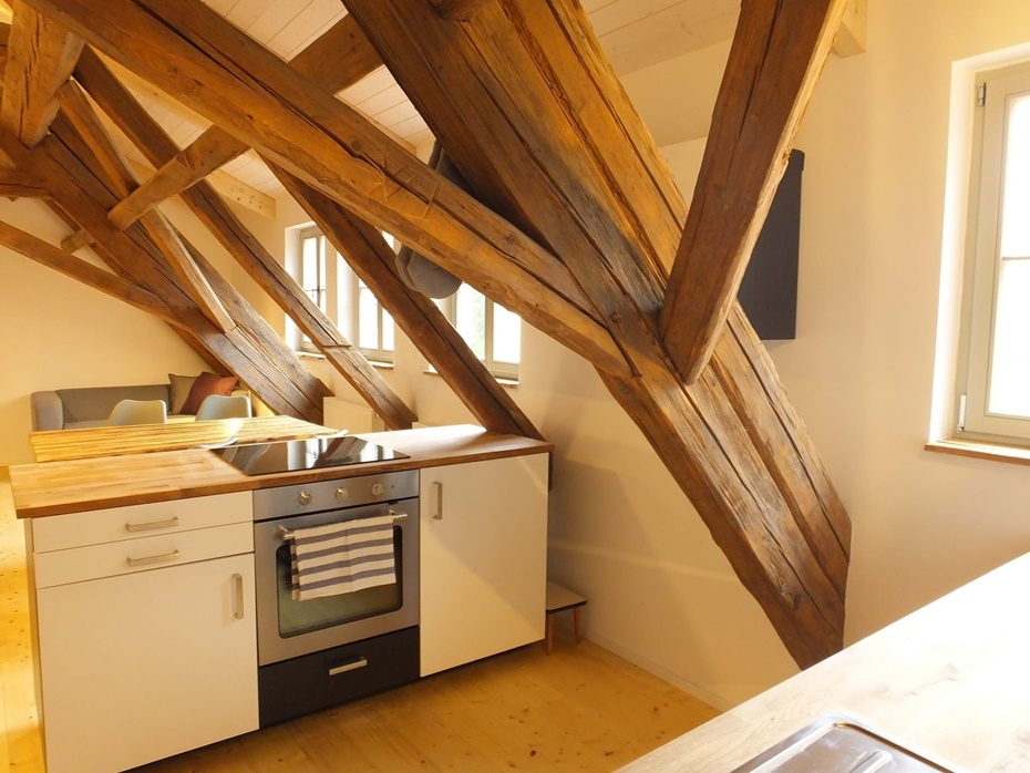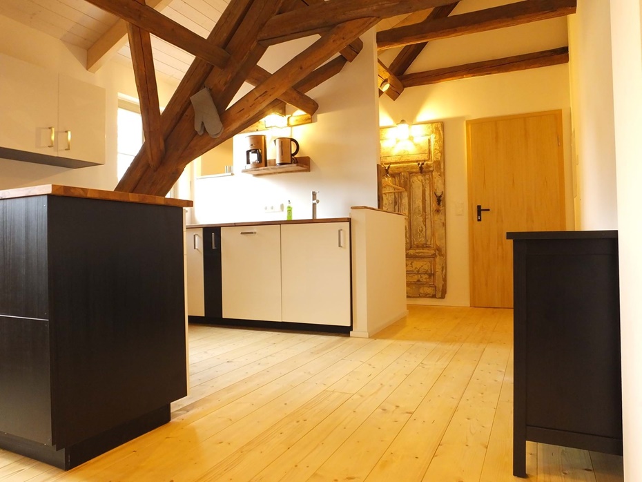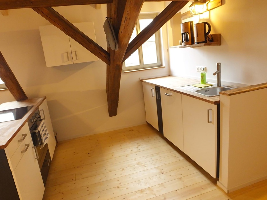 Küche Kühlschrank mit Gefrierfach, Induktionskochfeld, Backofen, Geschirrspüler, Wasserkocher, Kaffeemaschine, Toaster, Esstisch